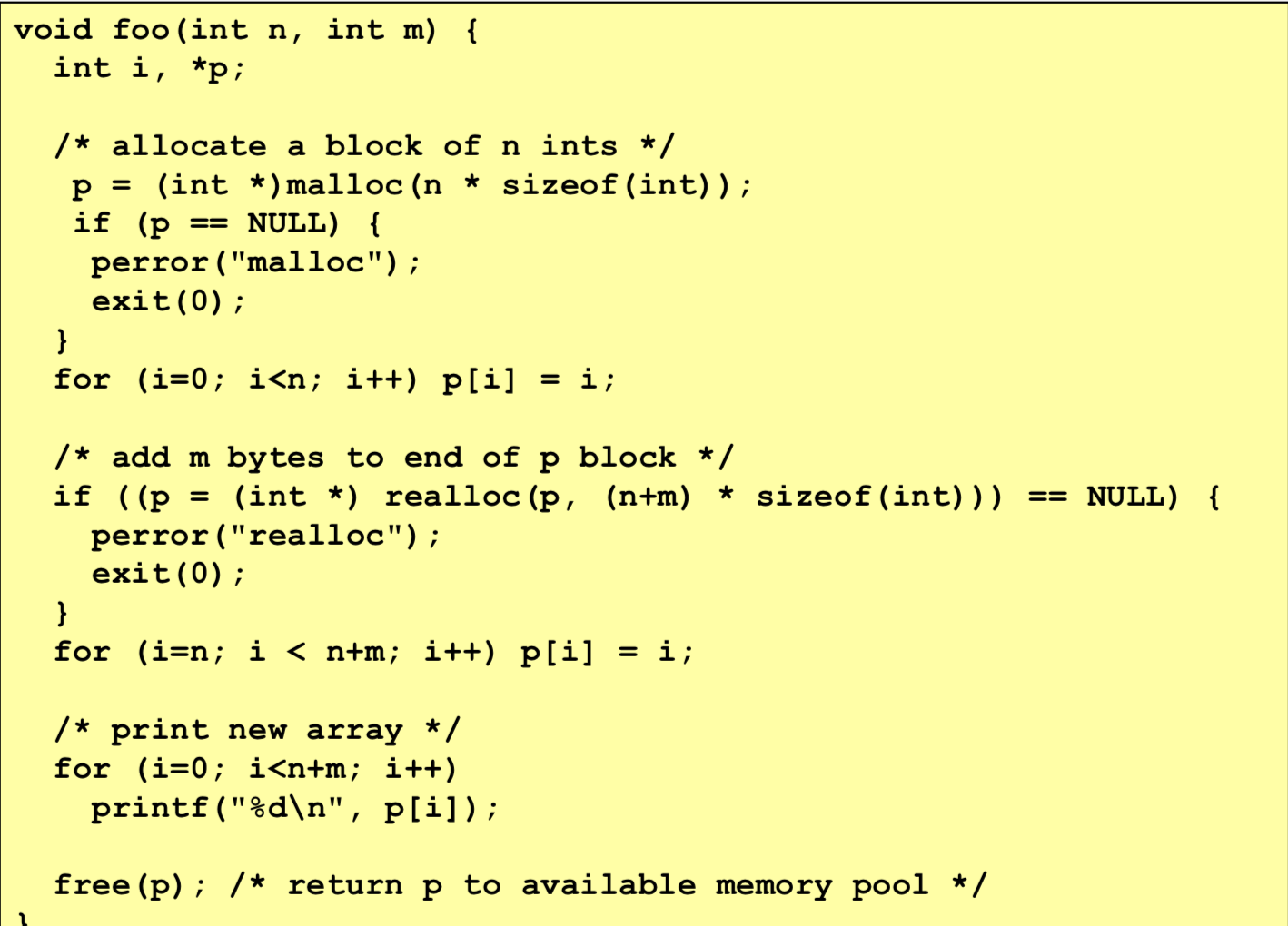 p에 int의 크기(4바이트) *n의 갯수만큼 의 바이트를 할당받고,for loop를 돌면서 각 iteration에 해당하는 i값에 을 할당한 p에 저장한다. **realloc은 미리 할당된 메모리에 대해서 재할당을 하는것이다.