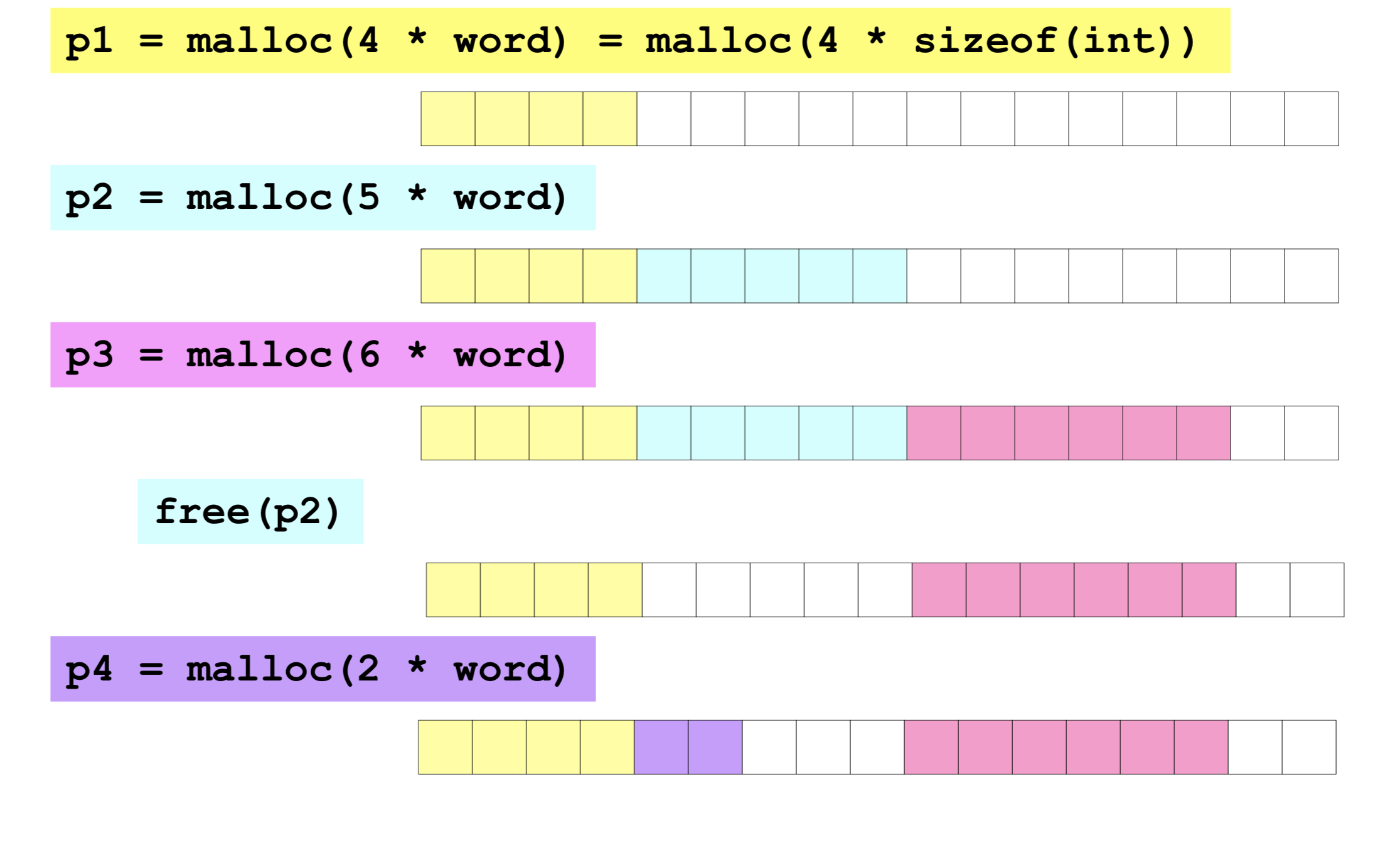 이런 헤더들의 정보를 이용하면, 비어있는 메모리의 부분을 알수있는 데, 쓰지 않는 메모리의 첫 부분들에 링크드 리스트같이 논리적으로 연결이 가능하다.